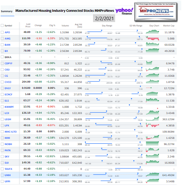 Manufactured Housing Industry Investments Connected Closing Equities Tickers