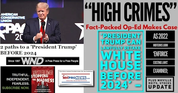 From the WND NewsCenter to MHProNews is the following guest op-ed which explains under their heading of “HIGH CRIMES” are the “2 [Lawful] paths to a ‘President Trump’ [Back in the White House] BEFORE 2024.” That will be paired herein with another arguably related letter that is linked from that fact-packed WND column. Additional information, with more MHProNews analysis, commentary, plus our Daily Business News on MHProNews manufactured housing market report will follow.