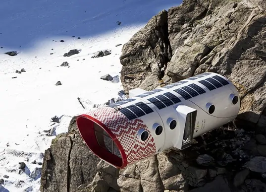 Inhabitat reports an Italian firm has developed an energy efficient tubular Alpine cabin designed especially for mountain climbers and skiers. LEAP(Living, Ecological, Alpine Pods) Factory’s Gervasutti refuge is solar-powered, weighs 5,500 pounds and has six contact points with the ground. The elongated modular contains nearly 100 square feet and will sleep 12. Straddling the France-Italy border, the unit was installed on 9,300 foot Mt. Blanc by helicopter in two days.