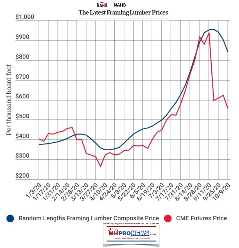 One more data point from the NAHB. Lumber prices are reportedly declining. Before MHI claims to have caused that through their advocacy, and informed industry members risk harming themselves from falling on the floor and laughing themselves to death, the NAHB graphic below is useful.