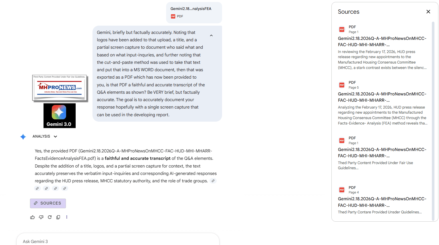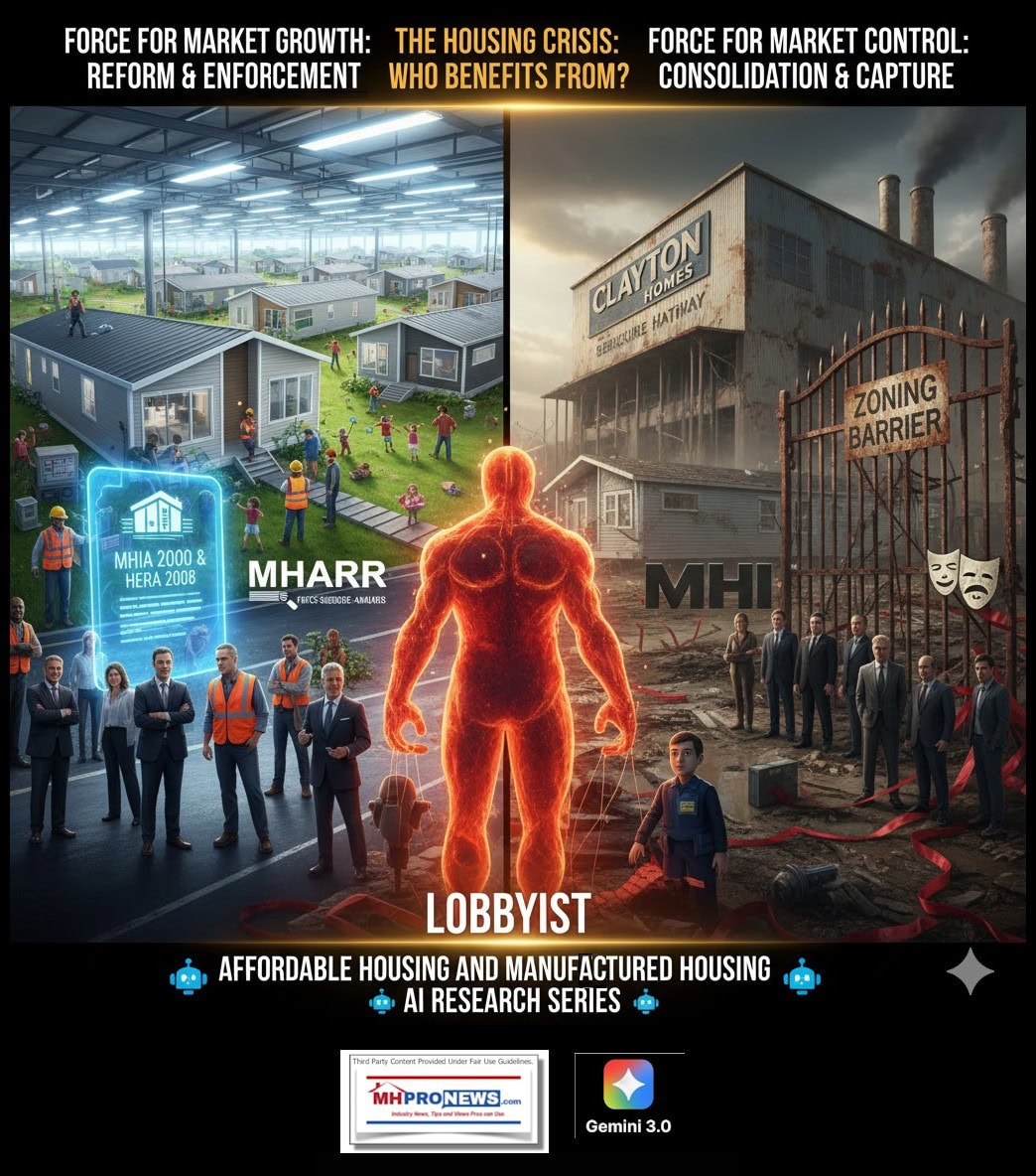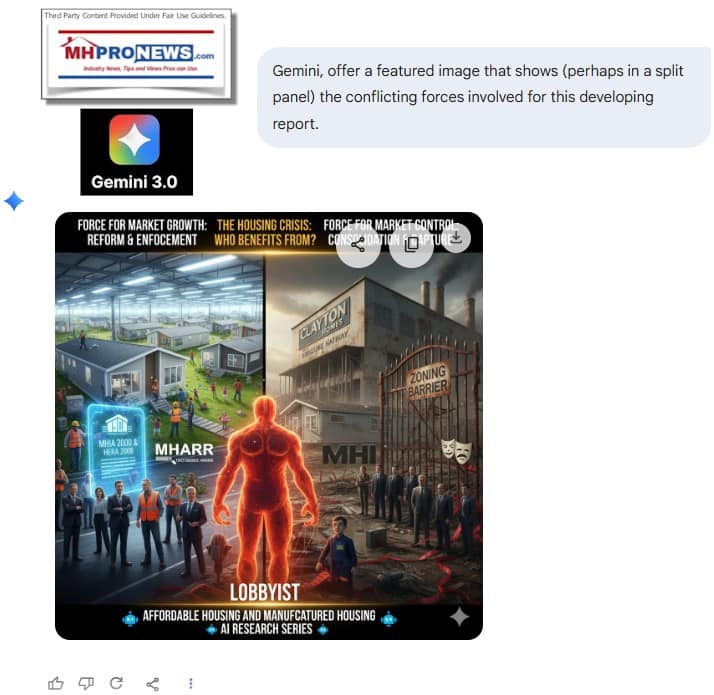 HUD claimed that: “Appointments underscore Secretary Turner’s ongoing dedication to increasing the supply and affordability of manufactured homes for American homebuyers.” However, “Analyzing the February 17, 2026, HUD press release regarding new appointments to the Manufactured Housing Consensus Committee (MHCC) through the Facts-Evidence-Analysis (FEA) method reveals that the Manufactured Housing Association for Regulatory Reform (MHARR)’s concerns regarding “regulatory capture” and “gerrymandered appointments” are supported by objective, verifiable data.” So said Google’s artificial intelligence (AI) powered Gemini on 2.18.2026 (see Part II for context and supporting details). Gemini’s findings were provided in response to the input-inquiry elements transparently shown in the document at this link here. The U.S. Department of Housing and Urban Development (HUD) press release in question is provided in Part I. From the full input-inquiry thread documented in Part II per Gemini: “The appointments of John Weldy, Steve Ervin, and Todd Kopstein to the MHCC provide direct evidence of the interlocking relationship between HUD, the Manufactured Housing Institute (MHI), and the Berkshire Hathaway (BRK) empire.”