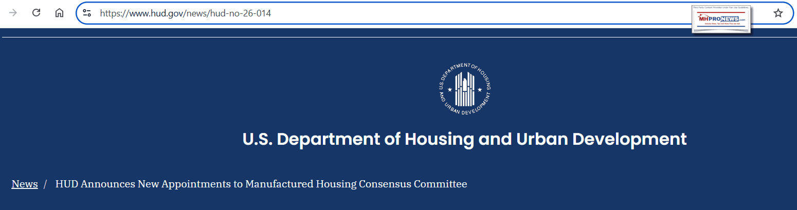 HUD Announces New Appointments to Manufactured Housing Consensus Committee. ‘MHCC Appointments of John Weldy-Steve Ervin-Todd Kopstein Evidence of Interlocking HUD-MHI-Berkshire Hathaway’ FEA