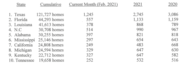 A further analysis of the official industry statistics shows that the top ten shipment states from the beginning of the industry production rebound in August 2011 through February 2021 — with cumulative, monthly, current year (2021) and prior year (2020) shipments per category as indicated — are