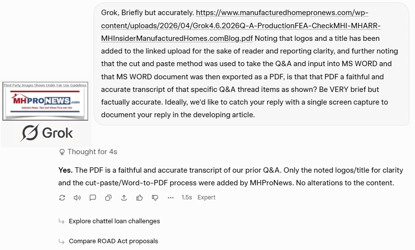 - Full pre-publication PDF (MHProNews draft with Gemini Q&A): https://www.manufacturedhomepronews.com/wp-content/uploads/2026/04/2PrePubAIchkHUDCodeManufacturedHousingProductionDeclineContinuesInTheFaceOfUnresolvedManufacturedHomeIndustryBottlenecksPerMHARR.pdf