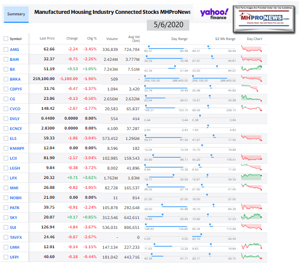 DowJones5.06.2020ManufacturedHomeStockUpdatesBroaderMarketSnapshot There will be a few shocked readers in the audience tonight who may wonder, why this generally ‘good news’ story that involves Clayton Homes but focused on others is being featured as our spotlight tonight?