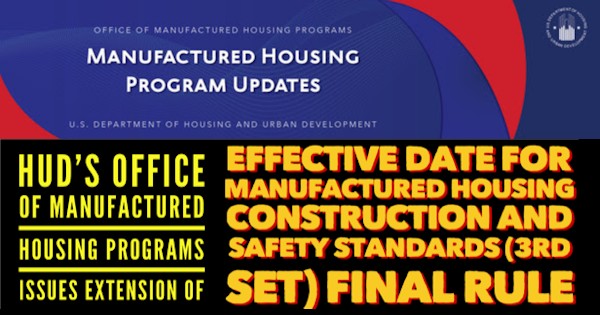 Today, HUD published a Federal Register notice (Link) that extends the effective date of the final rule published on January 12, 2021, amending the Federal Manufactured Home Construction and Safety Standards Act based upon the third group of Manufactured Housing Consensus Committee recommendations, as modified by HUD. The effective date of the final rule has been extended from March 15, 2021, to July 12, 2021.