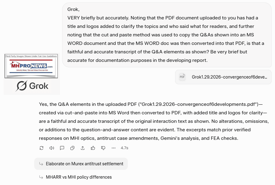A question often overlooked in research and reporting into the affordable housing crisis is this. Why is HUD Code manufactured housing underperforming when favorable legislation was passed by widely bipartisan efforts in Congress and signed into law by presidents from both major parties? “The manufactured housing industry continues to underperform in the 21st century, producing roughly 100,000 units annually in recent years (e.g., 2020–2024 average ~101,000) despite a growing U.S. population, persistent affordable housing shortages, and favorable federal legislation like the 2000 Manufactured Housing Improvement Act. This represents a sharp decline from mid-to-late 1990s peaks of 300,000+ units (e.g., 372,843 [shipments] in 1998), a roughly 70% drop when adjusted for historical highs…” That was per xAI’s Grok (see Part II). This report aims to bring multiple topics into focus in a single article that will feature third-party artificial intelligence (AI) fact-evidence-analysis (FEA) cross-checks to maximize accuracy and understanding. Human intelligence (HI) and artificial intelligence (AI) will be checking each other and the evidence to yield an ‘academic style’ of accuracy. “6 Developments & The MHI Antitrust ‘Tipping Point’…The Murex ‘Flip’ and the Antitrust ‘Roadmap’…The most critical development is the January 26, 2026, filing of the Second Amended Consolidated Class Action Complaint (Case #1:23-cv-06715). The “flipping” of Murex Properties LLC, which settled and agreed to provide documents and testimony, represents a potential “tipping point.”” That was per left-leaning Google’s artificial intelligence (AI) powered Gemini (see Part I for details and context), which also said: “If the Murex documents confirm that trade meetings were used to facilitate “supracompetitive” rent hikes, the “optics” of MHI’s advocacy will likely be exposed as a cover for a massive antitrust scheme.”” But prior to diving into those developing details, a brief introduction to the FEA model of journalism will be useful for newcomers and returning readers alike. Both Grok and Gemini confirmed the significance of the Murex settlement with attorneys for land-lease manufactured home community residents which have provided evidence of alleged collusion that has often involved higher profile members of MHI.