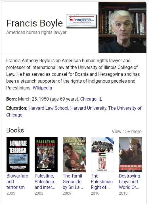 Boyle admits he has been “blackballed” by many in mainstream media and government due to concerns he raised post-9/11 about anthrax and other issues. While stressing that these are his current opinions that could change based on new information, Boyle explained how he was blackballed. “I was giving a lecture out at Harvard m[y] Alma Mater. I was running a panel on biological warfare for the council for responsible genetics and it was at Harvard Divinity School and as I was going in, there was a Fox camera crew there from Boston and I said it looks to me like this has come out of the US government lab. We know they do research and testing on anthrax. Then I said the same thing there at Harvard then I gave an interview to a radio station in Washington, DC then I gave an interview on that to the BBC. So the whole world saw it and at that point I was completely cut off and I’ve been cut off ever since.” Thoughtful readers should weigh that based upon the merits of other known or developing information.