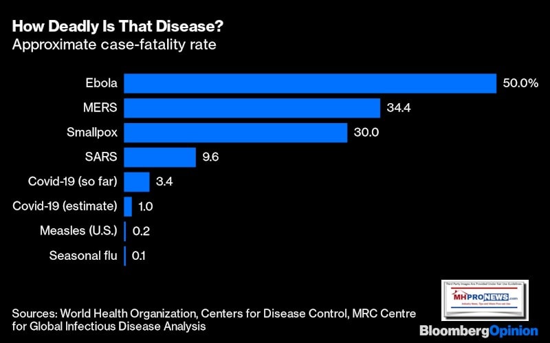 MHProNews previously published the graphic below, but that should be juxtaposed with the one above from Bloomberg. Note that the chart above estimates that the mortality rate of COVID19 will decline as additional data emerges.