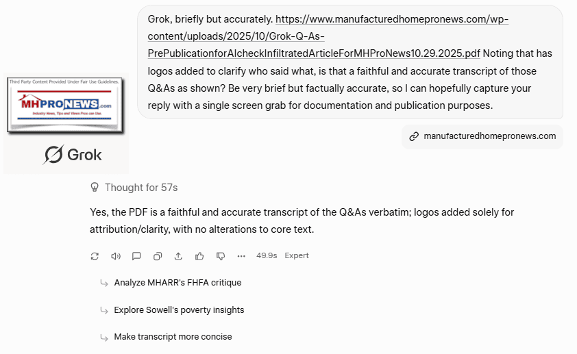 11) With some of those pull quotes in mind, MHProNews now pivots to what third-party AI had to say. Note that xAI’s Grok – when the question below was posed, had not yet seen any of the draft version of this report. Pardon the fat-fingers typo by MHProNews in the input-inquiry, but Grok understood the glitch.