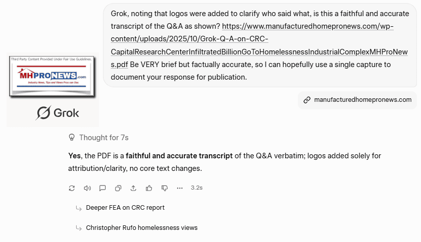 — MHProNews notes that the PDF of the full Q&A above, which includes the search results by xAI’s Grok, is confirmed as accurate by Grok via the screen capture linked here. —