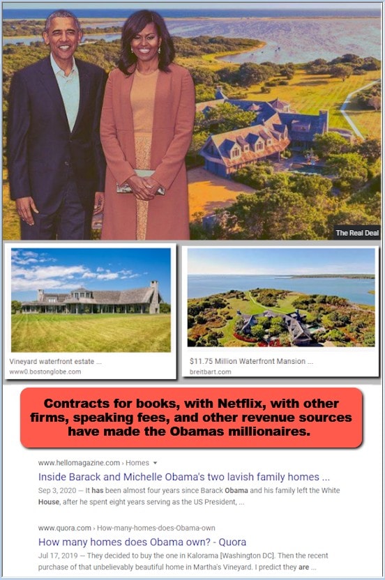 President Obama promised to fundamentally transform America. He was supposed to bring the races together. He was supposed to be a post-partisan president. The Obama-Biden Administration record proves that once in office, he did what politicians do, he rewarded his backers. Once out of office, what happened? The Obamas got big fat contracts from entertainment, media, oligarchs, plutocrats, and their multinational corporations that put him and reelected him in office. Once the Obamas left the White House, ignoring claims of the rising oceans, ex-prez Barack and his wife Michelle took some of their post-Oval Office millions in contracts money and bought an ocean side mansion in posh Martha’s Vineyard valued at some $11.75 million dollars. Since some people don’t believe something unless they see it from either a left or right source, here is a collage from some of each of their mansion. But they have other fine homes too.