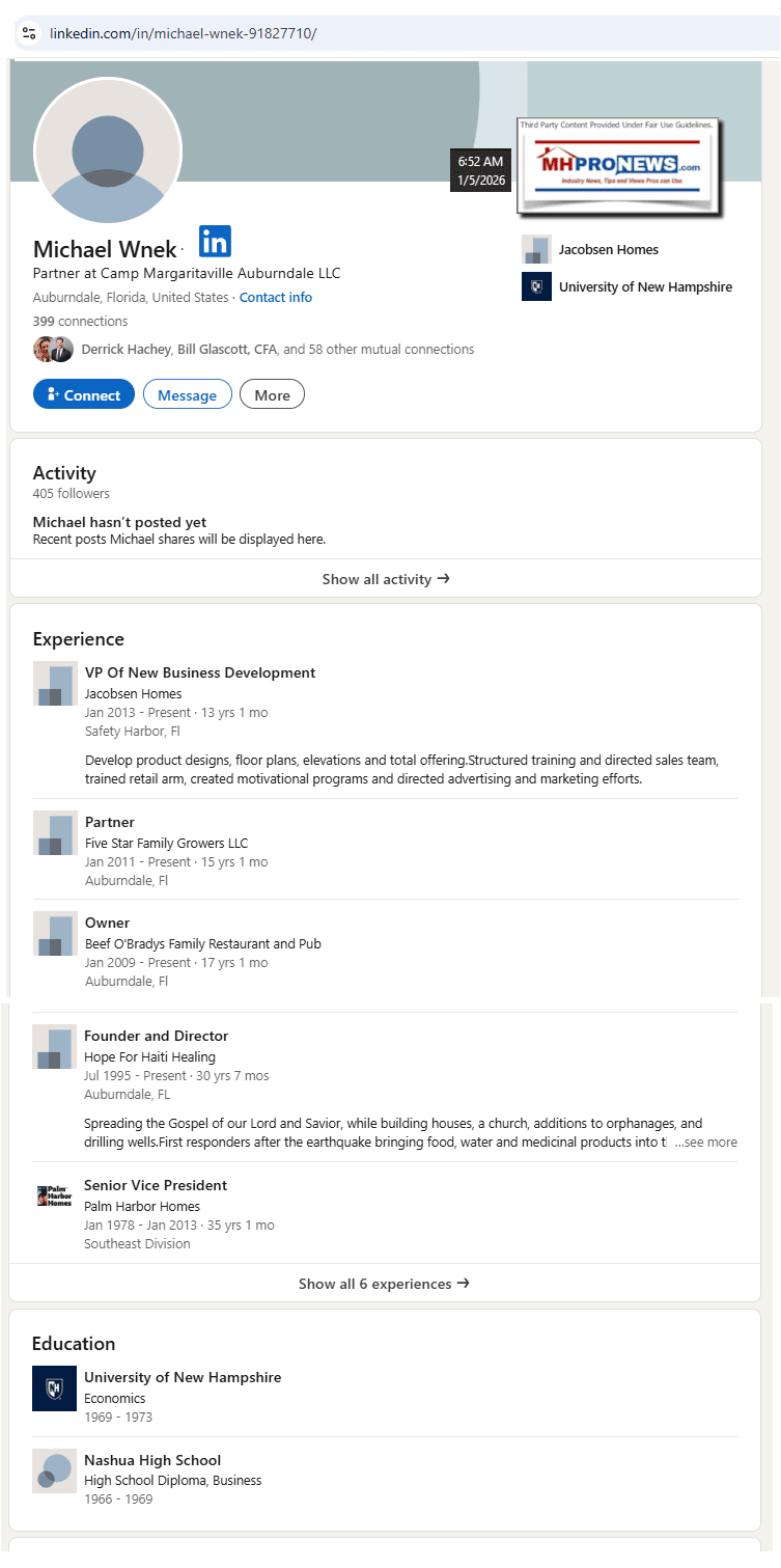 “New research from StorageCafe shows Florida now leads the nation with more than 824,000 manufactured homes, accounting for about 8% of all housing statewide,” said the Scripp News Group in a report entitled “Manufactured homes gain popularity as affordable option in Tampa Bay area.” Per ABC News affiliated Tampa Bay 28 report as part of their “The Price of Paradise” series (see video here) said “One of Florida’s largest manufactured home builders is Jacobsen Homes in Safety Harbor, and Vice President Mike Wnek said he is working to change outdated perceptions of manufactured housing.” Per their transcript: “reporter Erik Waxler is listening to those who tell us it’s a great option to break into this increasingly expensive housing market.” On the one hand, MHProNews observes that Scripps/ABC News affiliate Tampa Bay 28 credits but doesn’t link or critique the claim attributed to StorageCafe for that organization’s recent research into manufactured housing. Jacobsen Homes is a prominent member of the Manufactured Housing Association for Regulatory Reform (MHARR) in Florida. The Florida Manufactured Housing Association (FMHA) and others have cited Jacobsen Homes as the top manufactured home builder in Florida as measured by volume. Industry sources tout Jacobsen Homes’ quality, as did owner Jon Bender, per that customer’s statements reported by Scripps/ABC News 28. Mike Wnek’s LinkedIn profile is linked here, which includes his years with Palm Harbor Homes.