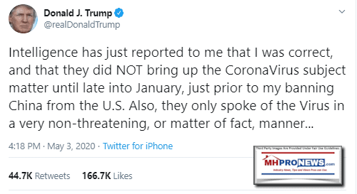 The Vanity Fair reported on 5.21.2020 pointed to a tweet by the president on May 5 that said: “Intelligence has just reported to me that I was correct, and that they did NOT bring up the CoronaVirus subject matter until late into January, just prior to my banning China from the U.S. Also, they only spoke of the Virus in a very non-threatening, or matter of fact, manner…” That left-of-center media source cited that as evidence that the president blames U.S. intelligence for failing to warn him earlier.
