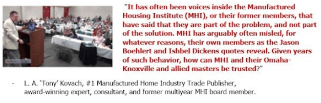 During a time-frame that MHI stood mute on a range of issues, MHProNews and MHLivingNews stood in the breach, while some of MHI’s own members ripped the organization for their problematic behavior that often fueled problems.