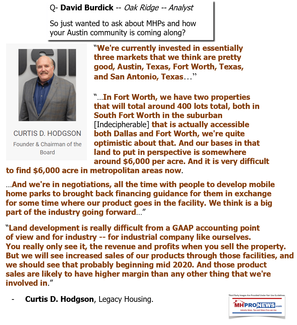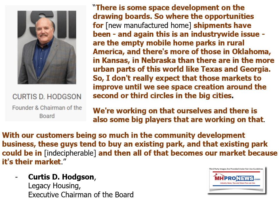The quotes that follow are not necessarily in the order that it was stated during the investor call. A prior comment by Legacy’s Curt Hodgson – the second one below – was added. These comments that belie posturing about industry momentum or MHI’s self-proclaimed effectiveness will be followed by an MHProNews analysis and commentary.