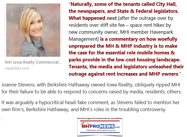 - Trade association and nonprofit failures. There are arguably good trade groups and poor ones, just as there are good businesses and bad ones, better and worse politicians, teachers, etc. The same principle applies for a range of nonprofits. That said, it is obvious that if mainstream media and much of the educational establishment has failed to convey an accurate picture on manufactured housing, that to some extent the fault must be laid at the feet of the Manufactured Housing Institute (MHI) and their affiliates. How so? First, because MHI’s leaders promised some 5 years ago to engage with the media, especially when problematic reports occur. Our periodic spot checks over the years have not found a single example of MHI engaging with a nonprofit, educational institution, or mainstream media in to correct a story. That is true even in cases when MHProNews directly asked MHI to get involved in an issue such as zoning discrimination in Texas and beyond. Still, nothing. The same is true with some of the university or other research involving manufactured housing or affordable housing. MHI can’t have it both ways. In an on-the-record remark cited above in our report last week on Harvard JCHS’ State of the Nation’s Housing 2021, they flatly told MHProNews that no one else in our industry contacted them with concerns. Only MHProNews/MHLivingNews did so. That’s one of several evidence-based examples that says much about just how far from MHI’s claims differ from MHI’s behavior. Or as MHI award winner Marty Lavin has said, pay more attention to what someone (or some group) does than what they say. The case can thus be made that our manufactured home industry is misunderstood to a significant degree because the evidence suggests that for well over a decade, MHI has failed to live up to its stated mission. That point, if true, may be a liability issue for their members and board members, see the legal opinion in the report linked here. But liability aside, that reality sheds light on MHI’s big corporate leaders and their actual vs stated agenda.