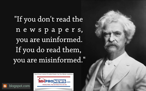 Our thanks to you, our sources, and sponsors for making and keeping us the runaway number one source for authentic “News through the lens of manufactured homes and factory-built housing” © where “We Provide, You Decide.” © ## (Affordable housing, manufactured homes, reports, fact-checks, analysis, and commentary. Third-party images or content are provided under fair use guidelines for media.) (See Related Reports, further below. Text/image boxes often are hot-linked to other reports that can be access by clicking on them.)