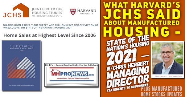 - Harvard’s JCHS said in remarks to MHProNews statements that support our contention. See the report linked on the Daily Business News on MHProNews, above.