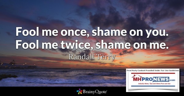 The point in part is – beyond disclosure – is that the players in this manufactured housing Iron Triangle have done a reasonably good job of posturing for years. For those who may read this and suddenly have their own “aha!” moment of the light bulb going off over your head, join the club. I had people that in their own words told me that the system was rigged, but I thought they might be mistaken. They were right. I was wrong.