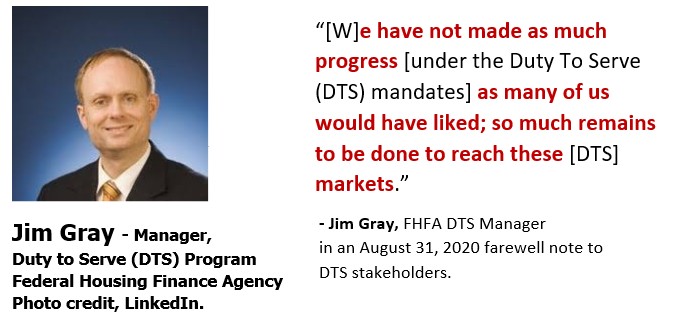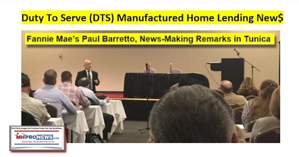 As a search of the website of the Manufactured Housing Association for Regulatory Reform (MHARR) reveals, they have for years pushed consistently for the DTS option. MHARR has long said that it was MHI that was the part of the roadblock. MHARR has also pointed the finger at FHFA and the GSEs. Call me slow, call me trusting. But before my ‘aha moment,’ after several voices from inside and outside of MHI – including input from federal officials – struck me like a thunderbolt, my common response prior to my awakening was to defend MHI and their insider brands. Their most recent report on the topic is linked below.