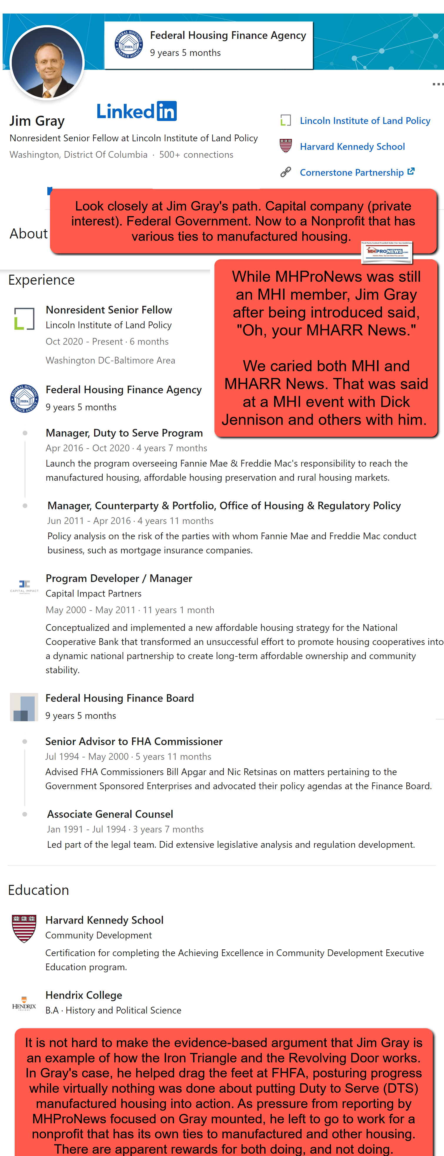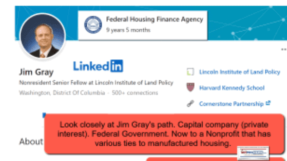 It would be tempting to say that it was fun shaking hands with Jim Gray, who later exited in his own apparent Iron Triangle move from FHFA to a nonprofit with ties to manufactured housing interested parties, plus those who care about protecting the site-built industry’s moat too.