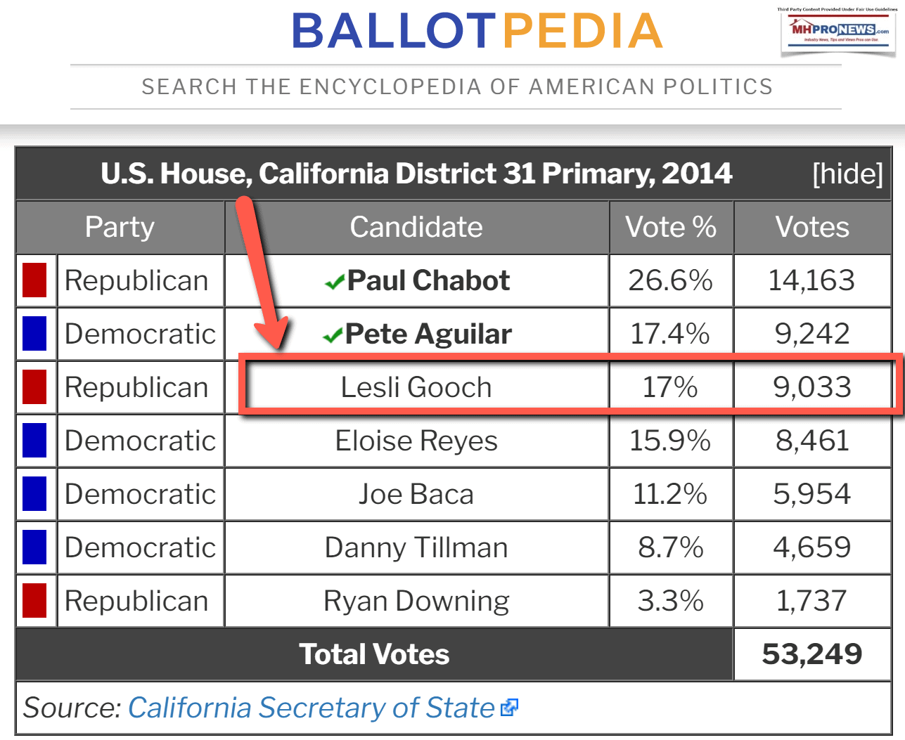 In a sizable field of candidates, Gooch came in third in her failed 2014 race. Ballotpedia said it like this: “Gooch ran in the 2014 election for the U.S. House to represent California’s 31st District. Gooch was defeated in the blanket primary on June 3, 2014.[3]”