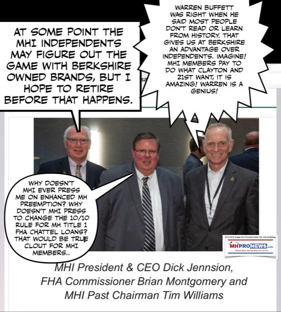 Our evidence- and rational-argument could be summed up simply. Gooch and MHI are corrupt pawns of Warren Buffett, Kevin Clayton, Tim Williams/21st, and a handful of smaller players that are happy to work with Berkshire at subverting manufactured housing from within. The Iron Triangle is part of the Moat. People posture while they hope no one notices the lack of progress and accountability. The rest are the details.