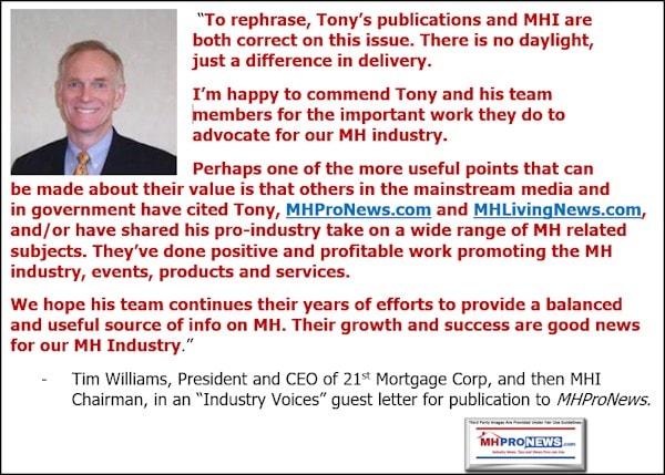 That Williams made clear in writing to MHProNews for publication that there was “no daylight” between what we as pro-growth trade publishers were saying to the manufactured housing industry’s runaway largest professional audience and what MHI claimed that they were doing.