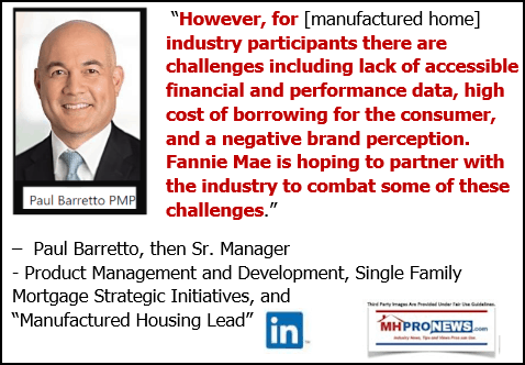 Several lenders are making loans in manufactured housing profitably. Yes, in the case of Superior, Triad Financial Services has a program that makes their success easier. But the entire charade of an argument that the GSEs need to get their feet wet on chattel lending before they go in full bore is obviously absurd. MHProNews blew that argument up at Tunica several years ago. Paul Barretto, then with Fannie Mae, has now gone on to another revolving door deal.
