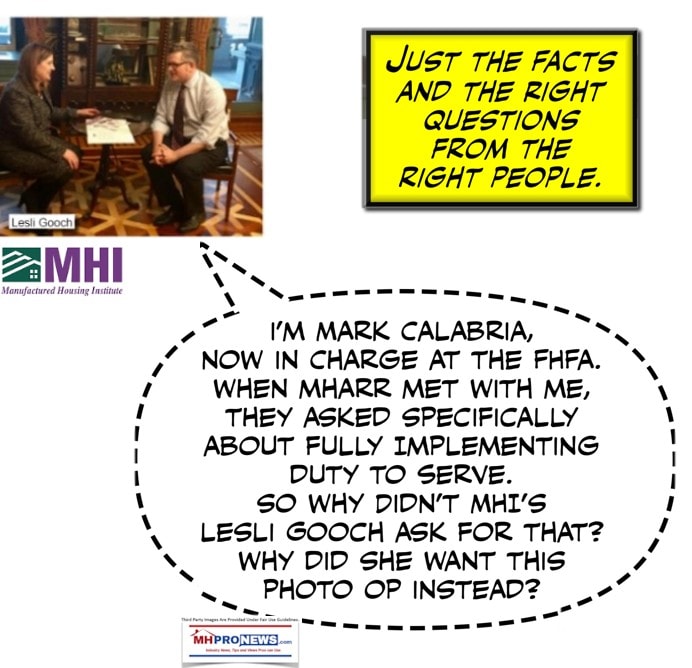 - “Lesli Gooch is [then was] the Executive Vice President of Advocacy and Communications for MHI.” In fairness, this is from the Freddie Mac website, which is one of the two Government Sponsored Enterprises (GSEs) that the DTS mandate from HERA 2008 applies to – they have an interest in this person. Note too, as MHProNews has documented, that both Fannie and Freddie paid MHI to co-sponsor MHI events.