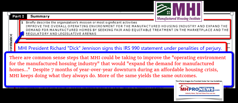 - MHI’s Gooch and her predecessor has to write letters that look or sound good. MHI and their leaders have to hold meetings that look impressive and provide photo ops. But actually, they are working for the consolidators. If Berkshire, or several other larger members – examples: Skyline Champion (SKY), Cavco Industries (CVCO), Equity LifeStyle Properties (ELS), or Sun Communities (SUI), et al pulled out – then some of the MHI staff would either have to go, and/or there would be big pay cuts, and other embarrassing cutbacks.