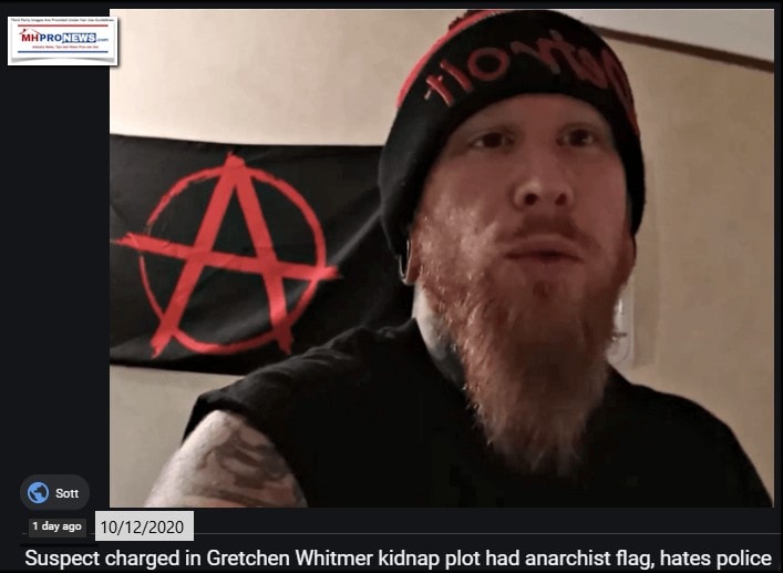 Note that despite allegations that President Trump instigated the attack, one of the alleged plotters blasted the president along with Governor Whitmer. An anarchist flag is hanging in the background of one of those videos of that terror suspect. Some background will add context to that AP statement.