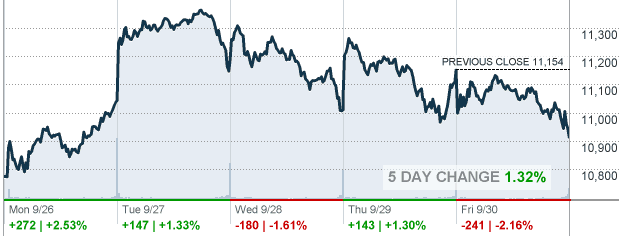 CNNMoney reports that 90% of consumers feel that economic conditions remain poor. In a quarter that witnessed turmoil over the EU/Greek bail out crisis, the downgrading of the U.S. credit rating and poor jobs reports, the Dow closed the quarter on a down note, 10,912.63 -241.35 (-2.16%), off -5.74% year-to-date. Yahoo! Finance Manufactured Housing Composite index 740.6 -0.50%. Affiliated Managers Group 78.05 -4.96 (-5.98%), but rose after hours. Clayton Homes, VMF and other MH building, lending and housing supplier parent company Berkshire Hathaway 106,800.00 -2,400.00 (-2.20%) Cavco Industries 34.44 -0.11 (-0.32%). Drew Industries 19.98 -0.37 (-1.82%). Equity Lifestyle Properties 62.70 -0.56 (-0.89%), and rose after hours. Nobility Homes 6.60 -0.50 (-7.04%). Palm Harbor Homes 0.01 +0.0035 (+38.89%). Patrick Industries 1.86 up a penny to +0.01 (+0.54%). Skyline Corporation 9.55 +0.11 (+1.17%). Sun Communities 35.19 -0.93 (-2.57%). Third Avenue Value Fund (9.29) 40.98 +0.59 (+1.46%). UMH Properties 9.09 -0.01 (0.11%). Universal Forest Products, Inc. 24.05 -1.45 (-5.69%), and rose in after hours trading.