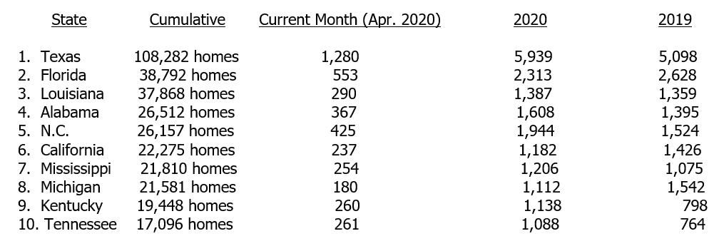 A further analysis of the official industry statistics shows that the top ten shipment states from the beginning of the industry production rebound in August 2011 through April 2020 — with cumulative, monthly, current year (2020) and prior year (2019) shipments per category as indicated — are: