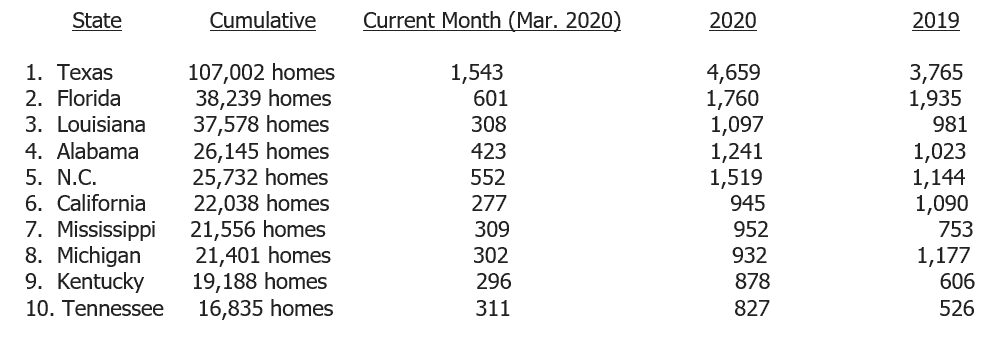 A further analysis of the official industry statistics shows that the top ten shipment states from the beginning of the industry production rebound in August 2011 through March 2020 — with cumulative, monthly, current year (2020) and prior year (2019) shipments per category as indicated — are: