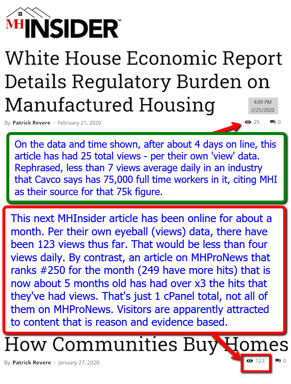 One purported answer is troubling. It involves a claim that the items are designed in part for investors and/or regulators to consider – in which case, it may be misleading them in a variety of ways. So, from time to time, it is worth looking at what industry professionals are reading, at what levels of engagement and how does that compare to other ‘similar’ resources based upon known evidence. Here is the engagement on two recent articles on MHI alligned MHInsider.