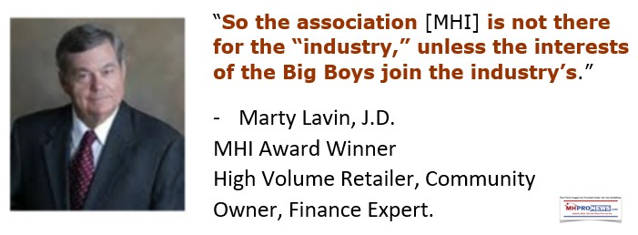 Speaking of sources, one must acknowledge those that went before us. MHARR has fought the good fight for years, and have arguably had MHI try to grab credit for work that they often did or led the initial charge on. There have been others who patiently ‘schooled’ us on what is occurring in manufactured housing, some of whom are current or former MHI members. Think Marty Lavin, Frank Rolfe, Dick Moore, Bob Crawford and others.
