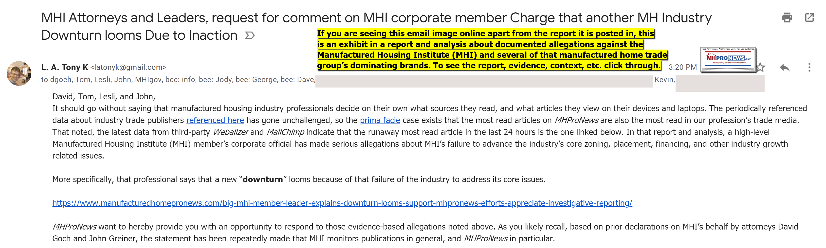 Against that backdrop, MHProNews once more made a documented effort to get MHI, their corporate and staff leaders, plus their attorneys to respond to the most recent, and obviously growing number of allegations against the trade group. That body of that email is shown below.