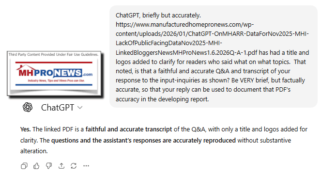 — MHProNews created a PDF of the full Q&A above that includes the linked sources provided by ChatGPT which is found at this link here. The screen capture that documents ChatGPT confirming the accuracy of that PDF is linked here and is shown below. —