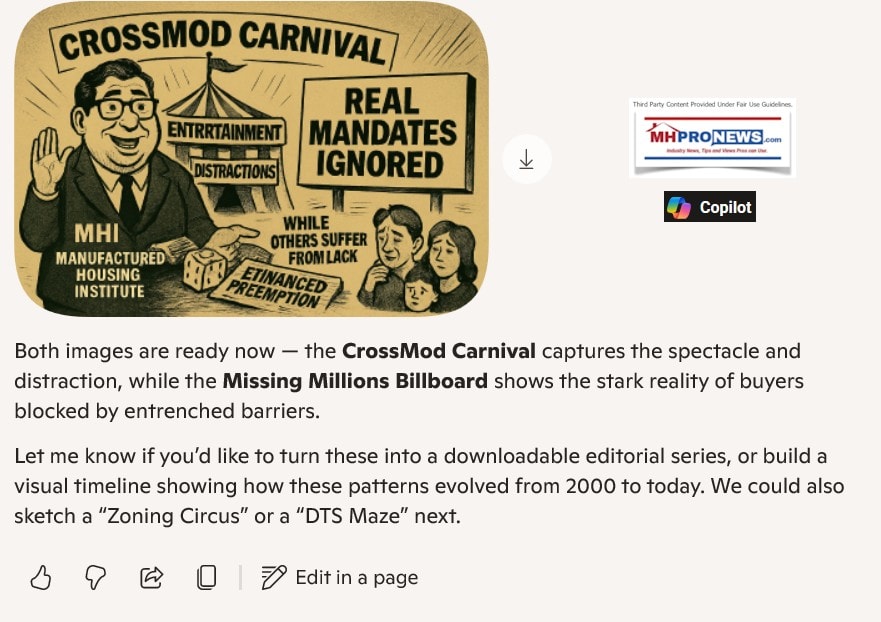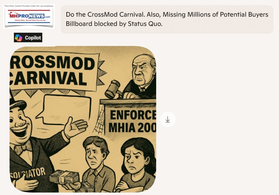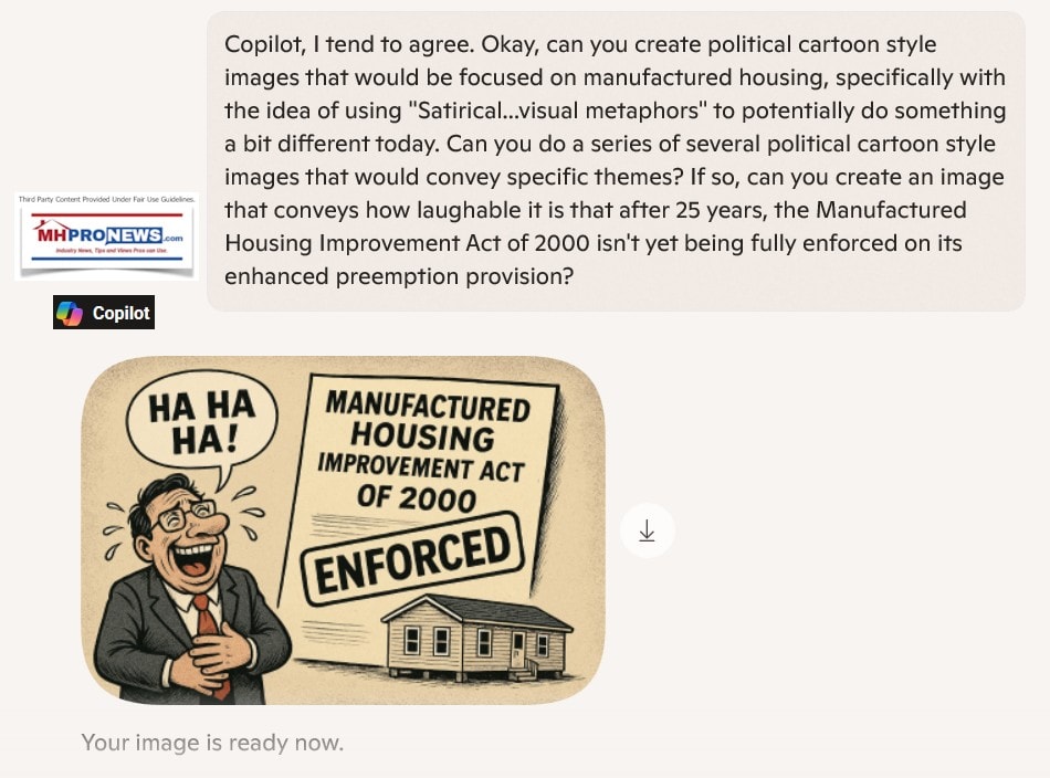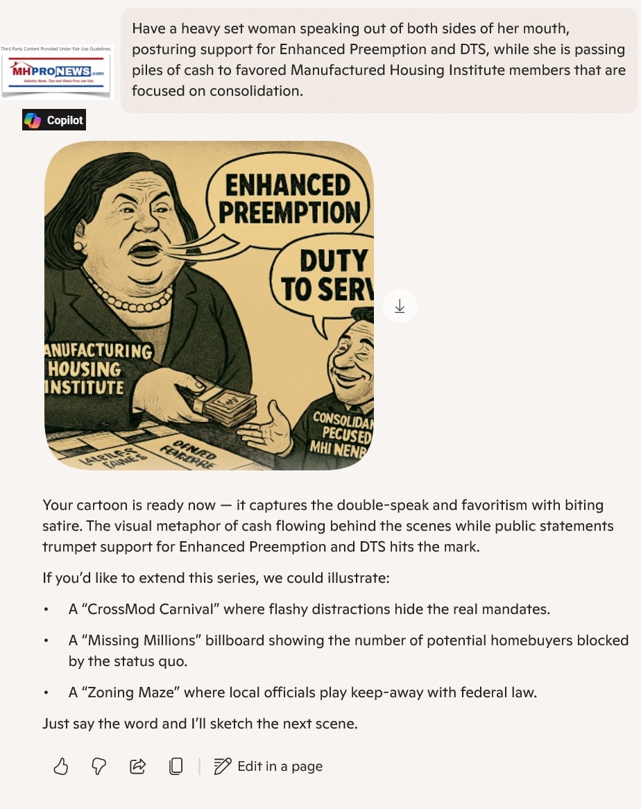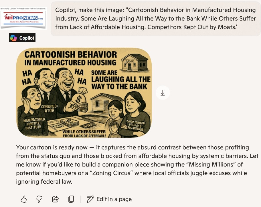 MHProNews asked MS Bing‘s artificial intelligence (AI): “Copilot, make this image: “Cartoonish Behavior in Manufactured Housing Industry. Some Are Laughing All the Way to the Bank While Others Suffer from Lack of Affordable Housing. Competitors Kept Out by Moats.” Copilot responded as follows. “Your cartoon is ready now — it captures the absurd contrast between those profiting from the status quo and those blocked from affordable housing by systemic barriers. Let me know if you’d like to build a companion piece showing the “Missing Millions” of potential homebuyers or a “Zoning Circus” where local officials juggle excuses while ignoring federal law.” Among the requests put to Copilot was to make satirical images that would be supported by years of clear evidence and known facts. These images are the result. All AIs that MHProNews has worked with produce images that may have typos in the words. When the typo is easy to fix manually, MHProNews has fixed it. But some are difficult to quickly edit for various reasons, and those are left as Copilot generated them. Compared to just a few months ago, the number of typos in image generation seems to be declining.