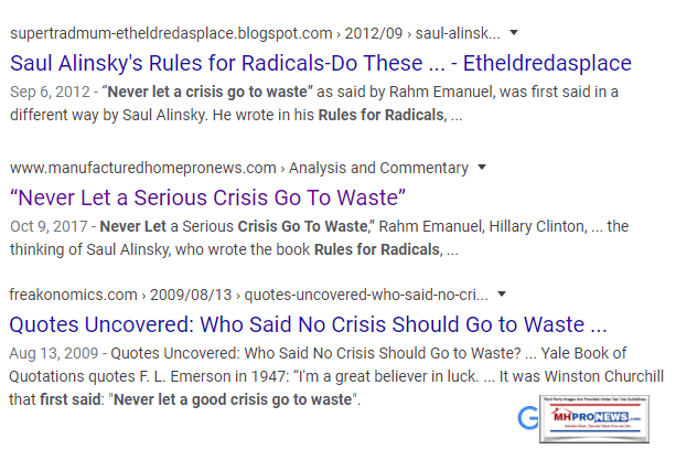 Our opening quote from Rahm Emanuel was previously used in an article published on MHProNews in 2017. As with most news sites, MHProNews keeps an article posted once it is published. That article has surged to the number two most read article on the website, perhaps due in large part to people doing internet searches on that famous phrase by Emanuel.