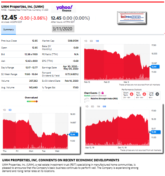 The coronavirus and the plunge in oil prices are thought to have been among the influences that have sparked the sharp drop in the stock price of UMH. See the related report in the featured forces section of last night’s investment and stock report linked below.