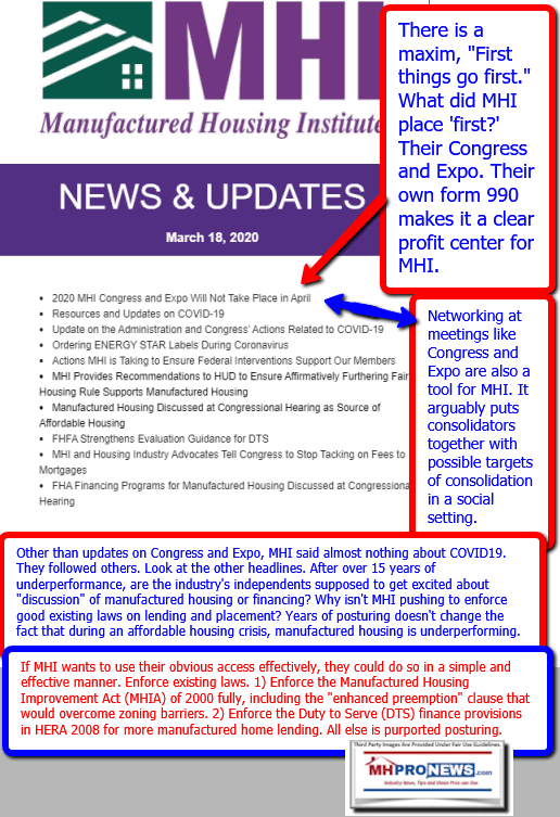 In the wake of the ongoing reports by MHProNews on the coronavirus/COVID19 related topics, MHI has ramped up their messaging on that front too. Here is a screen capture of their own summary of a recent email.
