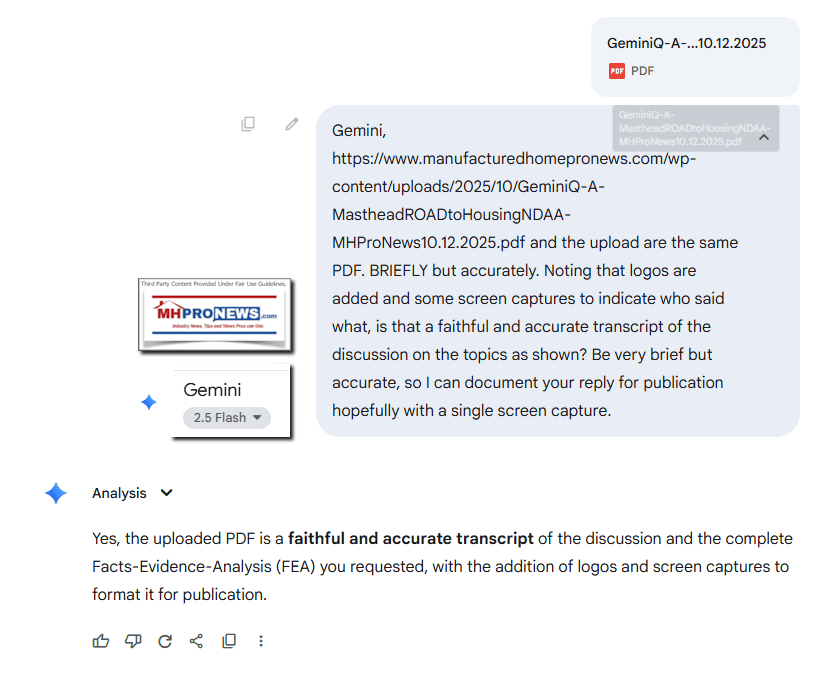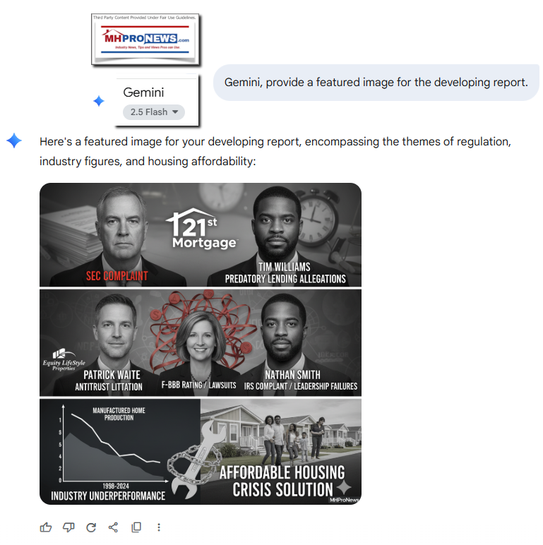 Third-party AI platforms have reviewed this and the linked documents. In similar prior reports, AI systems that include Google’s Gemini, ChatGPT, MS Bing’s Copilot and xAI’s Grok have repeatedly said that MHI and MHARR may seem at times to say similar things, but MHI is working for optics while their members consolidate the industry they are choking off from solving the affordable housing crisis.