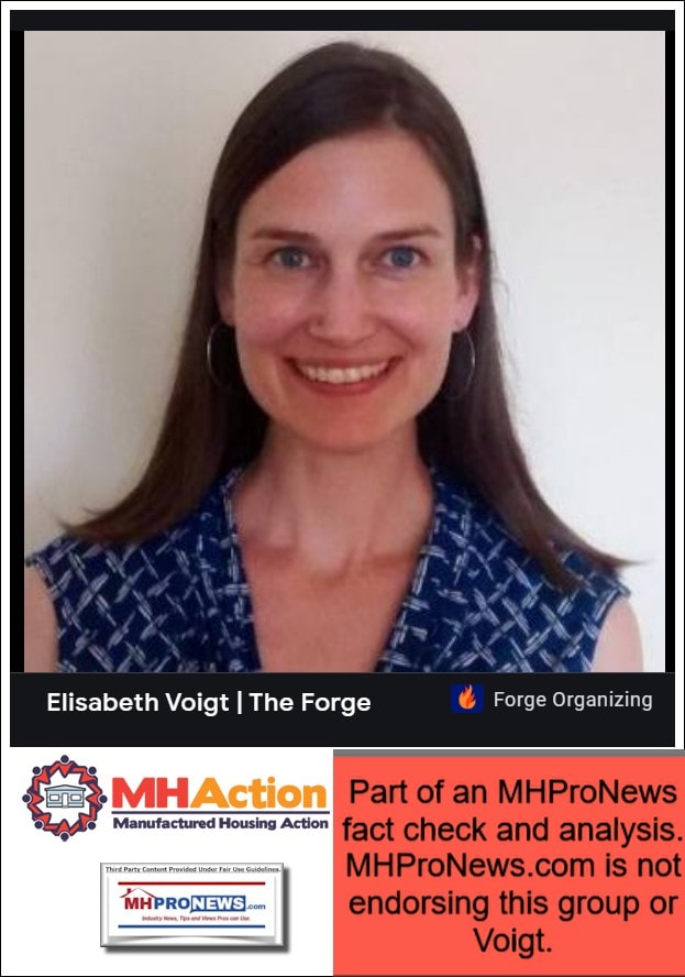 Elisabeth “Liz” Voigt, J.D., has previously worked for HUD, the Obama presidential campaign, and several left-leaning groups, as her LinkedIn profile reflects. She has submitted on behalf of Americans for Financial Reform Education Fund (AFREF) and Manufactured Housing Action (MHAction) comments that will be shown below.