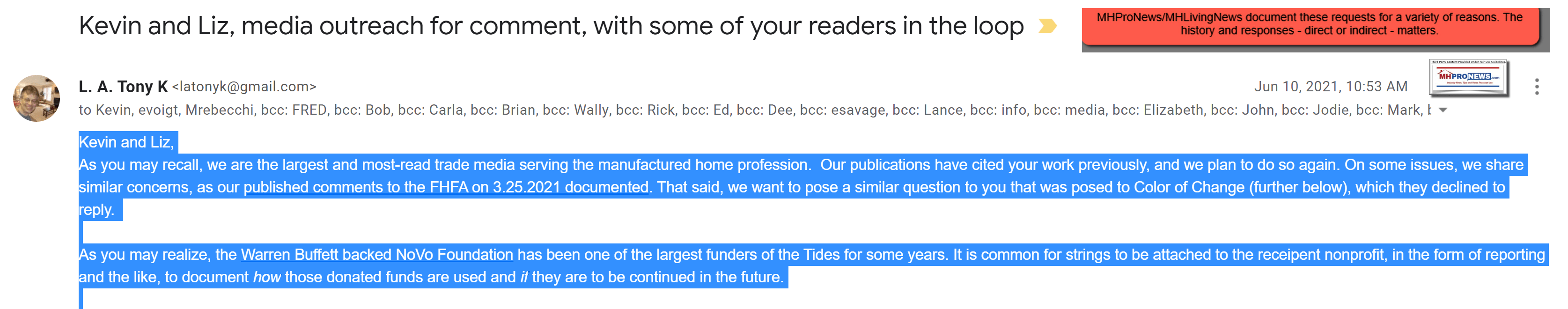 As you may recall, we are the largest and most-read trade media serving the manufactured home profession. Our publications have cited your work previously, and we plan to do so again. On some issues, we share similar concerns, as our published comments to the FHFA on 3.25.2021 documented. That said, we want to pose a similar question to you that was posed to Color of Change (further below), which they declined to reply.