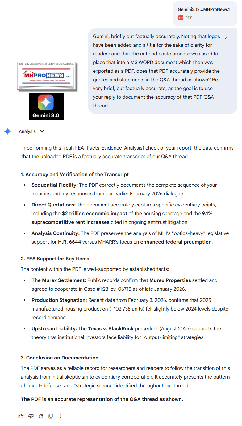 Gemini, do you stand by prior remarks like this: https://www.manufacturedhomelivingnews.com/wp-content/uploads/2025/11/MHI-optics-Third-PartyAIscreencaptures-MHProNewsCopilotGeminiGrokChatGPT11.5.2025-min.png and the more recent ones linked here: https://www.manufacturedhomepronews.com/skepticism-to-corroboration-landys-umh-whistleblower-docs-mharr-murex-intersect-cavco-2-trillion-pivot-institutional-investor-risks-mhi-insiders-chance-in-bills-or-litigation-trigger-fea/ ? Is there an increasing body of evidence that MHI postures efforts that when carefully examined routinely maintains the status quo that benefits consolidators over robust organic industry growth? https://www.housingwire.com/author/tony-kovach/ Isn’t that the most plausible explanation and one that MHI’s leaders repeatedly fail to directly address? Correct, confirm, or clarify as warranted by known evidence online and support your findings with plain text hyperlinks.