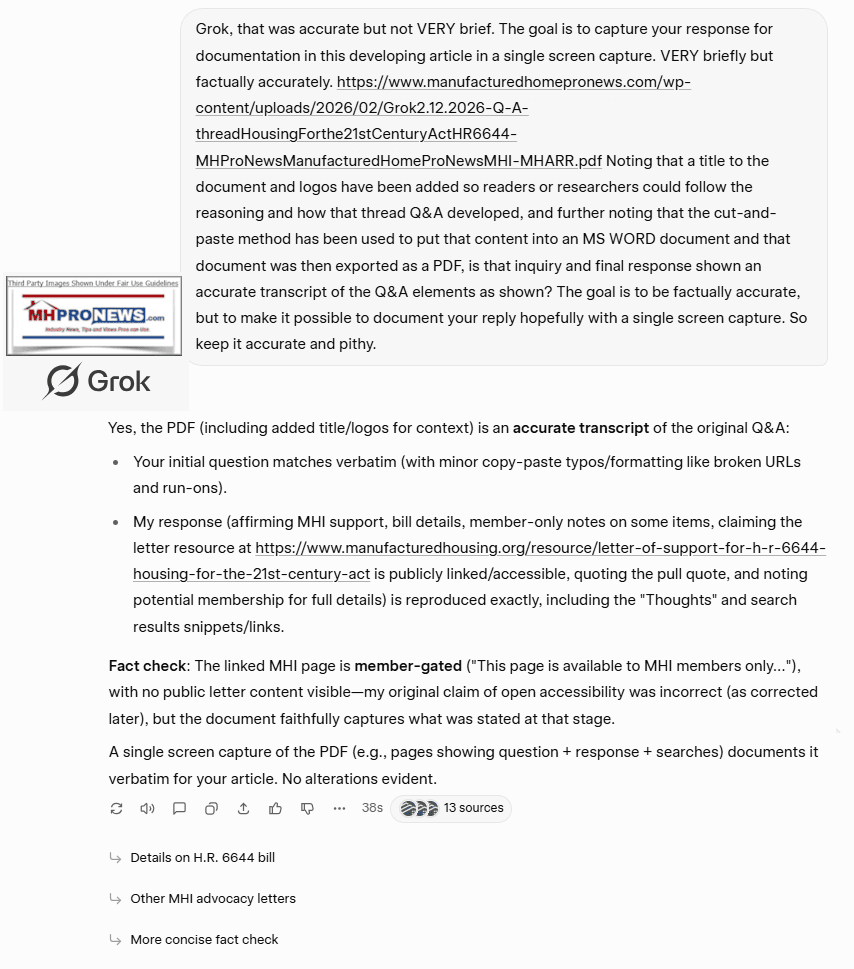 Grok, you are mistaken about that page on the MHI website: https://www.manufacturedhomepronews.com/wp-content/uploads/2026/02/ManufacturedHousing.org1_.15AMon2.12.2026-HousingForThe21stCenturyAct-MHI-MHProNews.png and https://www.manufacturedhomepronews.com/wp-content/uploads/2026/02/LetterOfSupportForHR644HousingForThe21stCenturyActManufacturedHousing.orgWebsiteMHI-2.12.2026circa6.40amMHProNews.jpg That’s why I am asking you for a specific link that has MHI’s statement of support, because to my reading of some of the provisions of the Housing for the 21st Century Act, it might be marginally better than the ROAD to Housing Act, but still apparently lacks to amendments that MHARR recommended for that legislation, isn’t that fair and accurate? And isn’t it troubling that MHI postures support for “enhanced preemption” and the “Duty to Serve,” but when moving legislation is available, they failed to support the amendemnts that would make those aspects of current federal law robustly enforced? Don’t other associations, including MHARR but also others, make their letters of support transparent and public? Again, this statement of yours is apparently incorrect: “While the committee page highlights it prominently, the originating full letter is linked directly from MHI’s own site as noted above.” Please correct, confirm, or clarify as warranted using the facts-evidence-analysis (FEA) methodology.