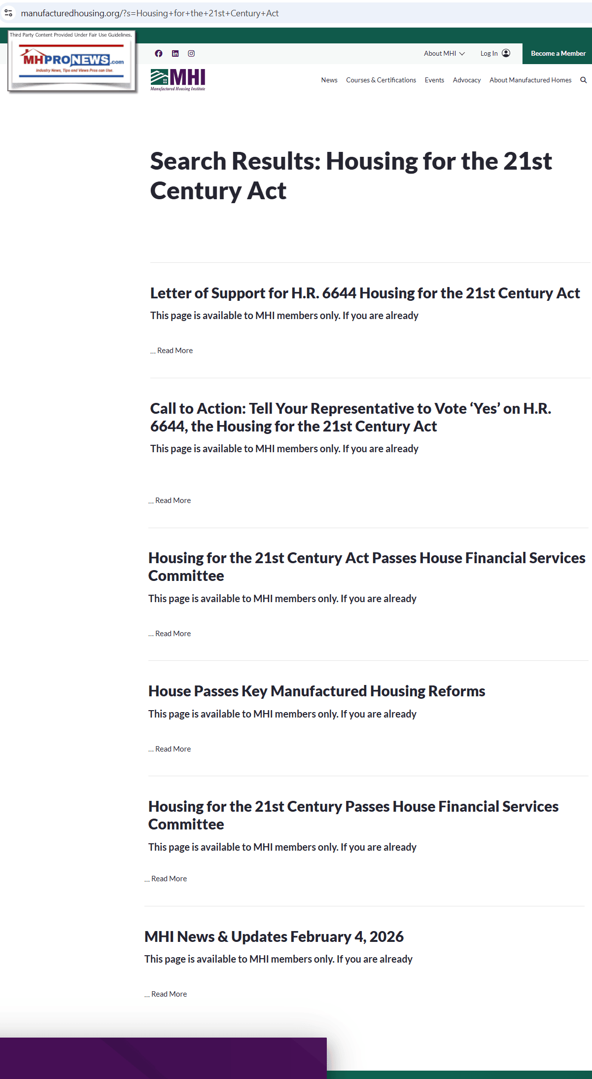 - Your provided screenshots (from manufacturedhomepronews.com, captured around February 12, 2026, circa 1:15 AM and 6:40 AM) confirm this: they show the MHI site listing the “Letter of Support” resource, but the linked page requires membership, with no public viewing of the document.